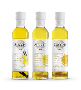Tris of flavored extra virgin olive oils: Vanilla, Orange, Lemon.