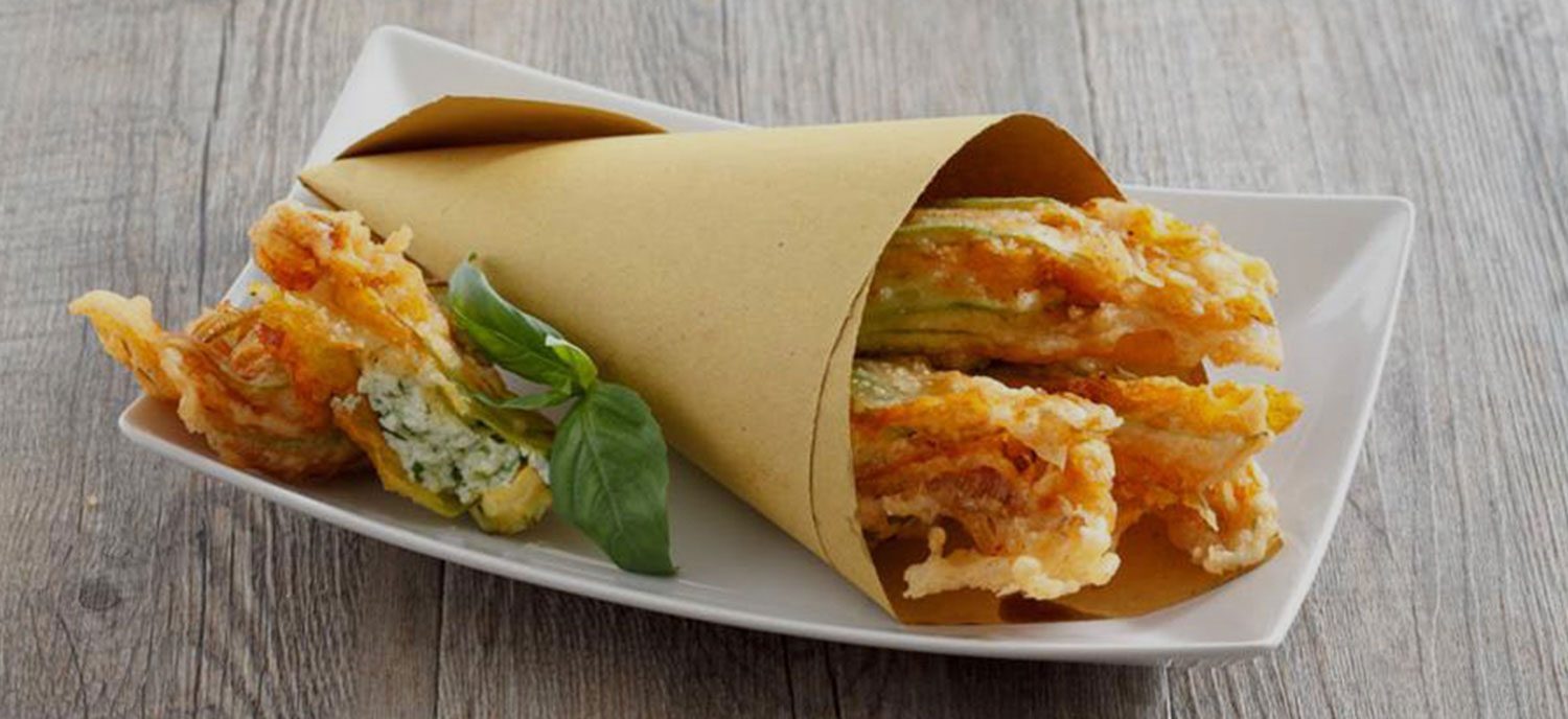 Pumpkin flowers stuffed with ricotta cheese with basil pesto, fried in Zucchi groundnut oil