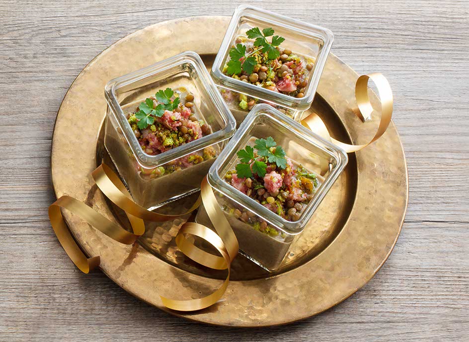 Creamed lentil cups with breadcrumbs, cotechino and Terra di Bari PDO extra virgin olive oil