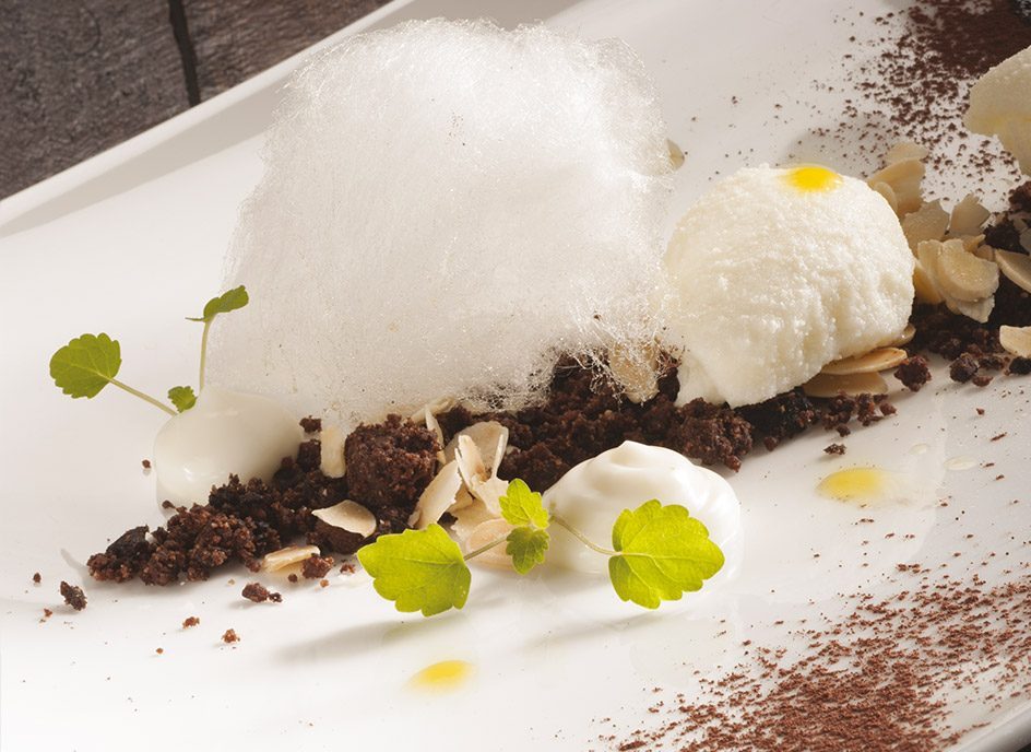 To finish: Place a layer of crumble on the base of the dish. Add one quenelle scoop of vanilla olive oil ice cream, drizzle with almond milk cream (see photo), decorate with cotton candy, watercress sprouts, cocoa and a drizzle of aromatized vanilla oil.