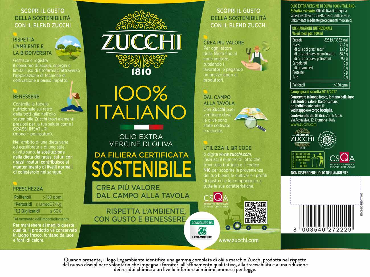 L’Extra vergine Zucchi 100% Italiano SOSTENIBILE è il primo olio nato da una filiera interamente tracciata e certificata sostenibile.