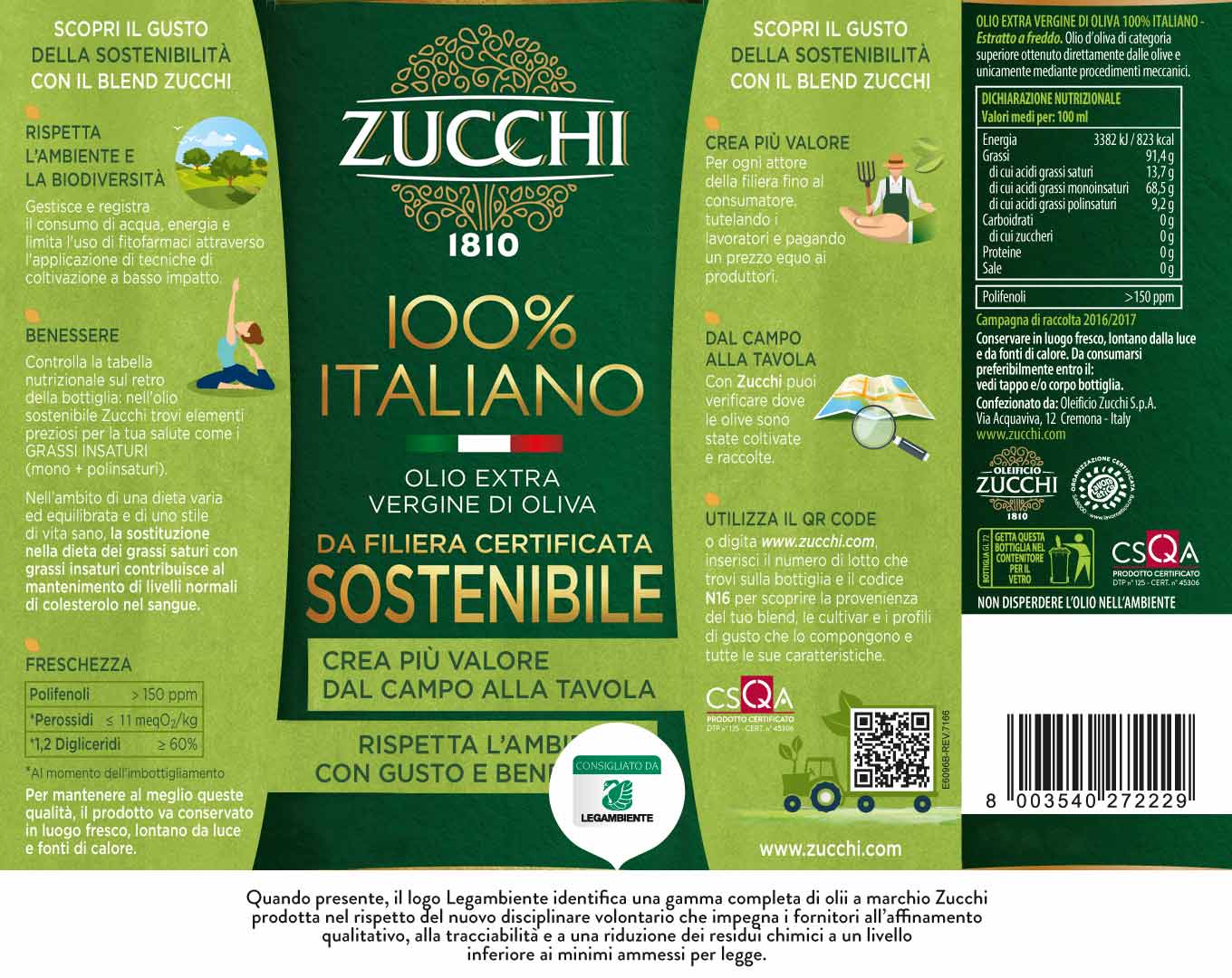 L’Extra vergine Zucchi 100% Italiano SOSTENIBILE è il primo olio nato da una filiera interamente tracciata e certificata sostenibile.
