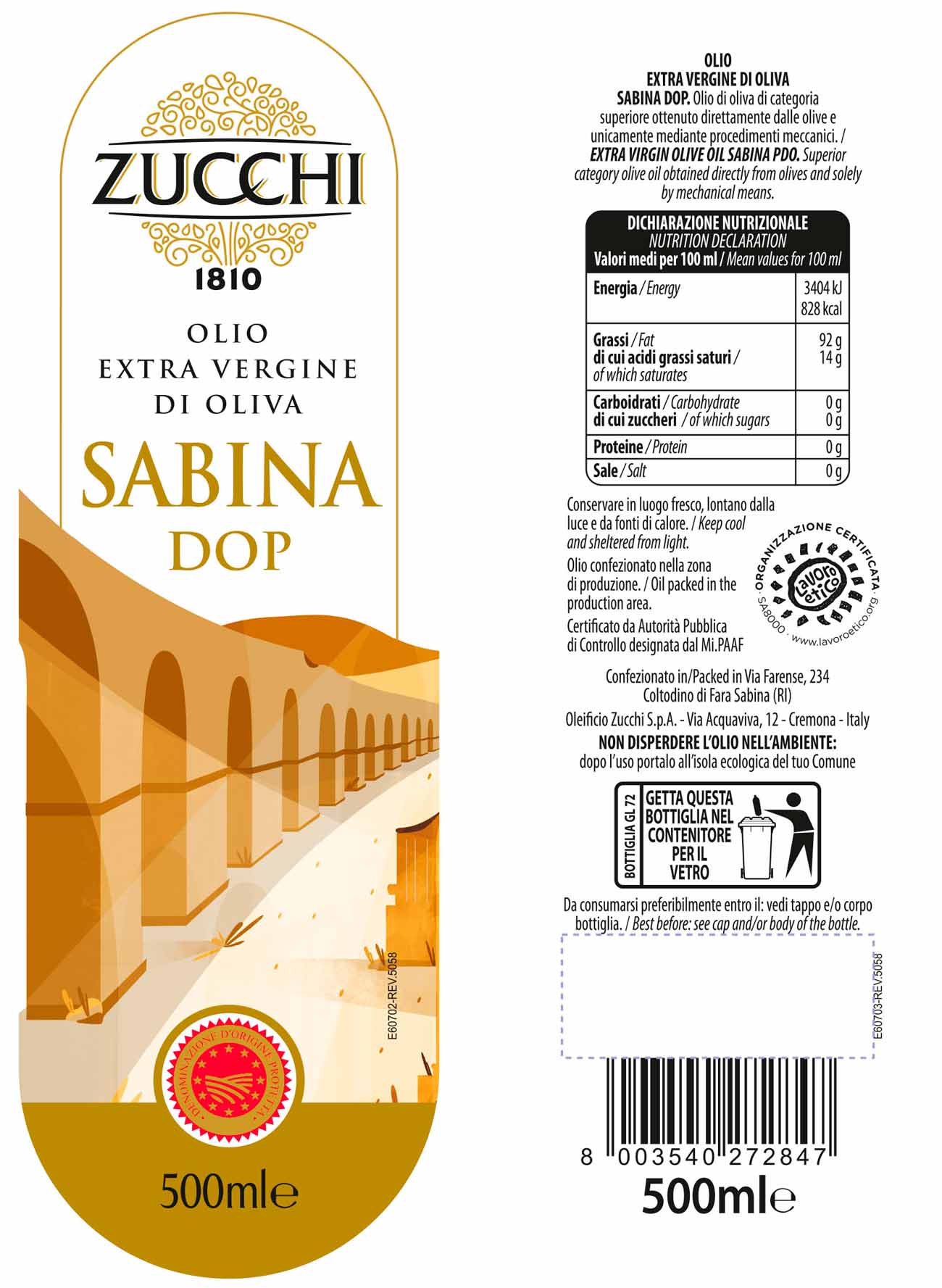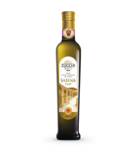 Caratterizzato da un fruttato delicato e armonico, con note aromatiche tipiche delle cultivar di provenienza, l’olio extra vergine di oliva Sabina DOP Zucchi è ottenuto dalle cultivar Carboncella (40%), Leccino (20%), Moraiolo (20%) e il restante 20% è costituito da Raja, Pendolino, Frantoio, Olivastrone, Salviana, Olivago e Rosciola. La zona di produzione comprende i territori nelle province di Rieti e di Roma.