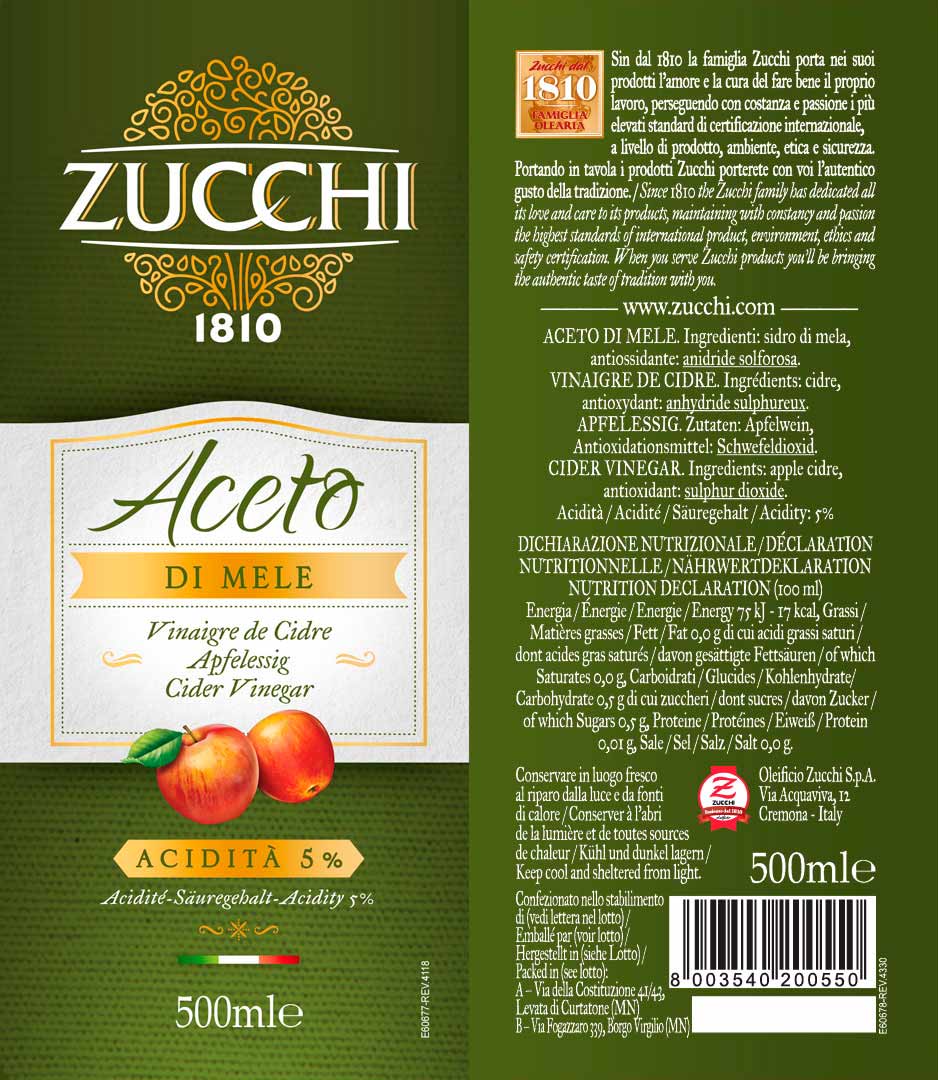 L’aceto di mele italiano è prodotto dall’affinamento del sidro o del mosto di mela attraverso il processo di acidificazione. Viene utilizzato per insaporire i cibi e aumentarne la digeribilità.