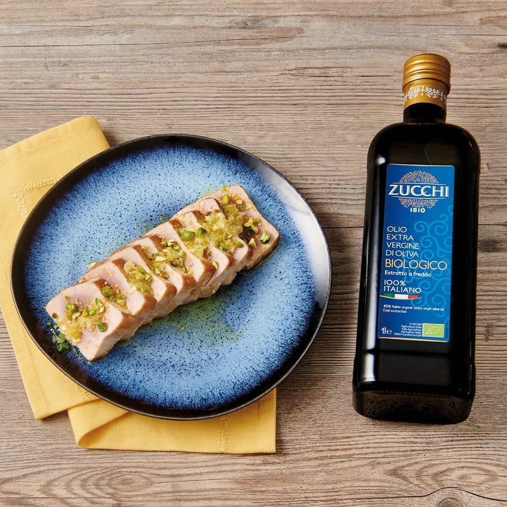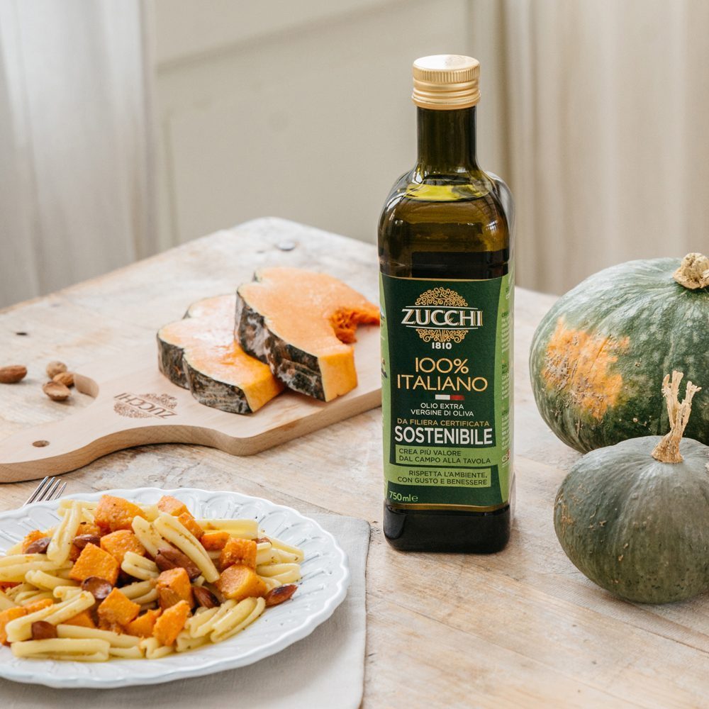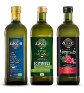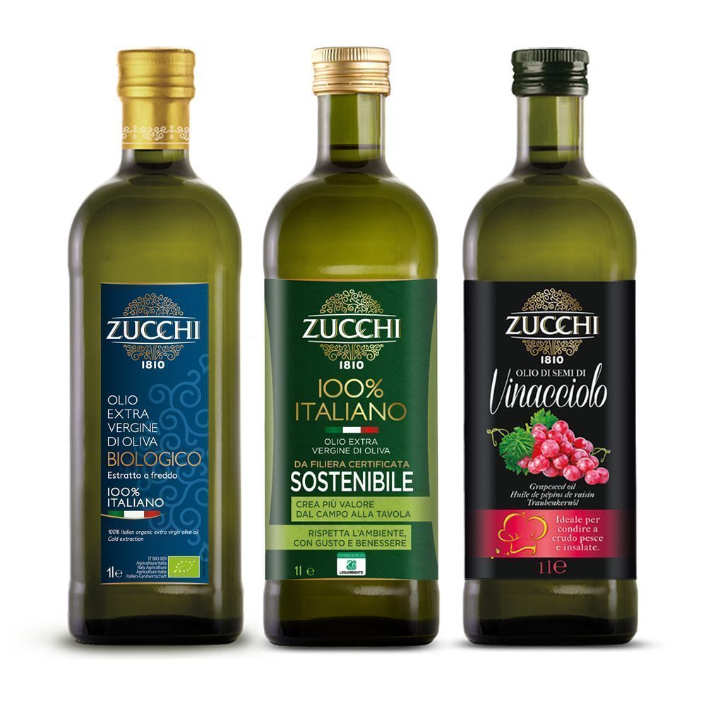 Tris di oli Zucchi nel formato da 1L: Olio EVO 100% Italiano Sostenibile Legambiente, olio extra vergine di oliva biologico 100% italiano e Olio di semi di vinacciolo.