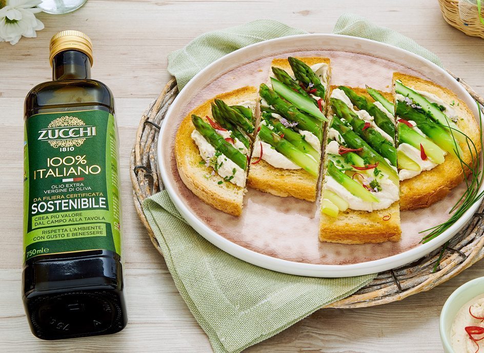 Spalmatele con la crema di tofu, disponete sopra gli asparagi, cospargete con il peperoncino tagliato sottile e condite con il condimento a base di olio extra vergine di oliva aromatizzato al limone Zucchi.
