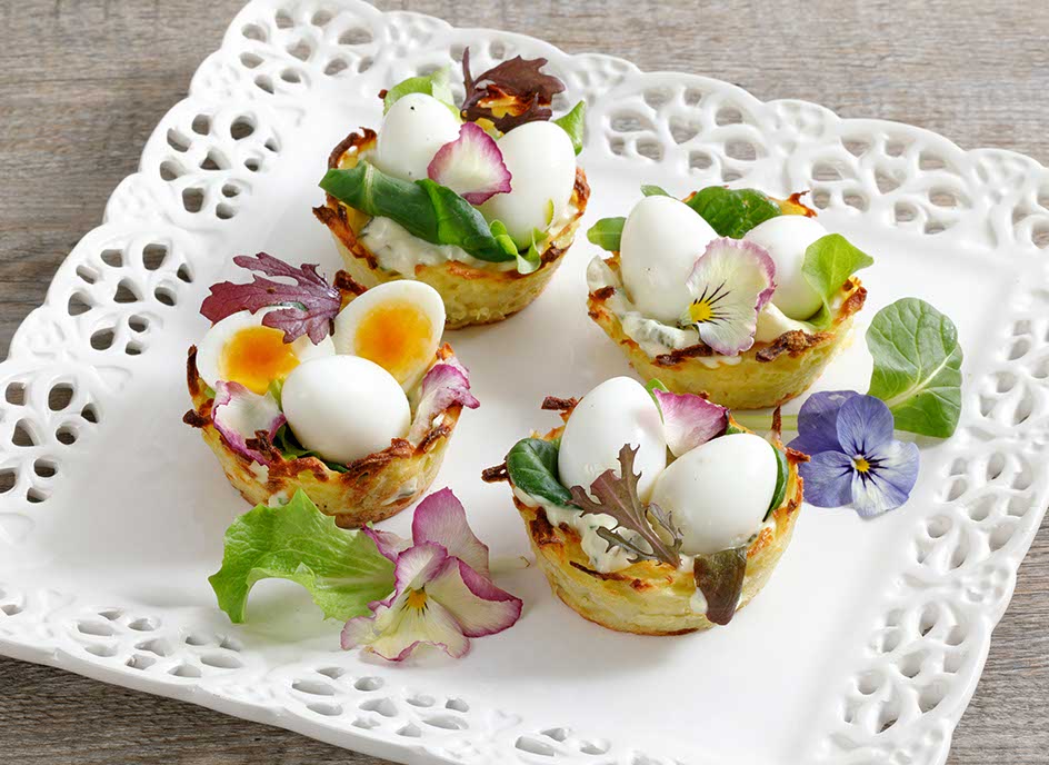 Per mantenere le uova di quaglia morbide al centro, lessatele per 2’ e 30 secondi dal bollore, quindi scolatele e raffreddatele in acqua fredda corrente per fermare la cottura. A questo punto componete i nidi. Farcite i cestini con la salsa tartara, decorate con qualche foglia di misticanza e fiori e adagiatevi sopra le uova di quaglia sgusciate.