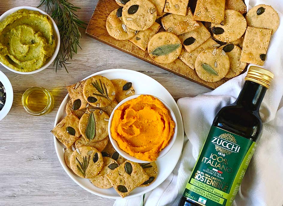 In una ciotola unite le due farine. Incorporate pian l’olio extra vergine Zucchi 100% Italiano Sostenibile, l'acqua e mescolate. A questo punto potete decidere se incorporare le spezie, le erbe aromatiche e i semi oleosi, continuate a impastare fino ad ottenere un panetto omogeneo e asciutto.