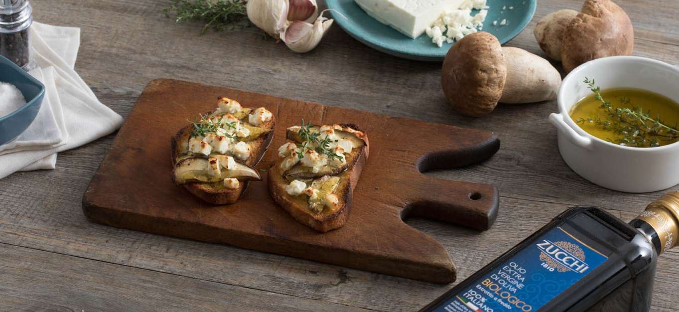 Crostoni con porcini e feta con olio extra vergine d’oliva 100% Italiano Biologico Zucchi aromatizzato al timo