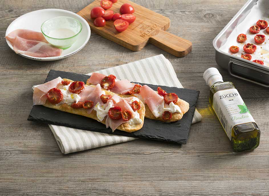 Focaccine con pomodorini confit e prosciutto di Praga con Olio extravergine d’oliva aromatizzato al basilico Zucchi