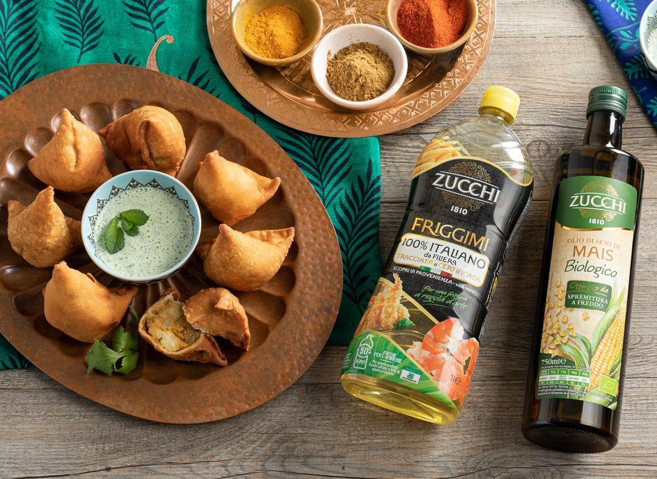 Riscaldate l’olio Friggimi 100% Italiano da filiera tracciata e sostenibile Zucchi in un pentolino a 170°C. Friggete due samosa alla volta per evitare che la temperatura dell’olio si abbassi, per circa 3 minuti girandoli su entrambi i lati. Quando saranno dorati, scolateli con una schiumarola su carta assorbente.