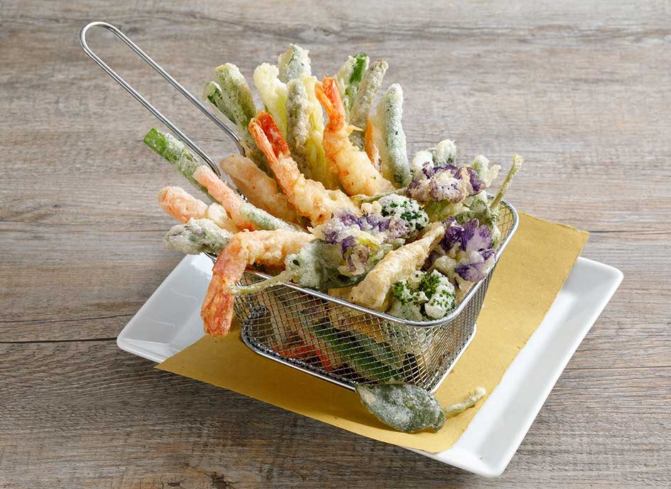 Tempura di gamberi e verdure con fiori eduli in Olio Friggimi 100% Italiano Zucchi