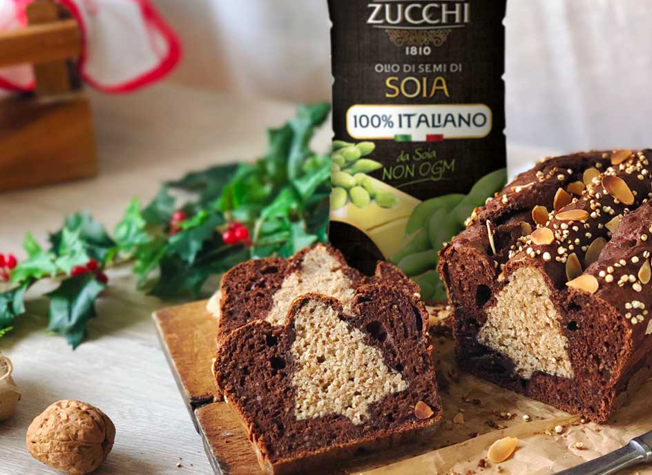 Per la base al cacao: in una ciotola sbattete le uova con la bevanda vegetale a base di mandorle. Setacciate in un'altra ciotola il cacao amaro, la farina manitoba e il lievito. Aggiungete lo zucchero, il mix di spezie, un pizzico di sale, l'olio di semi di Soia 100% italiano da filiera tracciata e certificata Zucchi e mescolate.