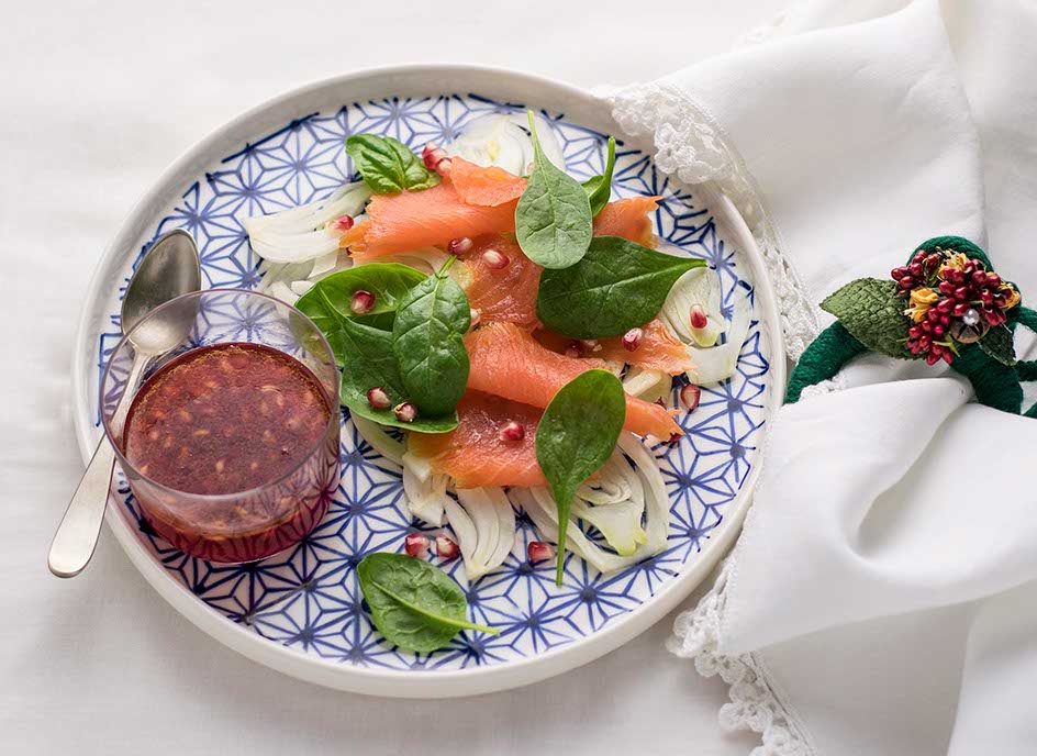 Insalata di finocchi, salmone con vinaigrette di melograno e olio di semi di sesamo