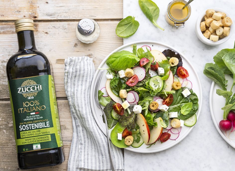 Insalata mista con pomodorini, mela, pane tostato e feta con olio EVO 100% Italiano Sostenibile Zucchi