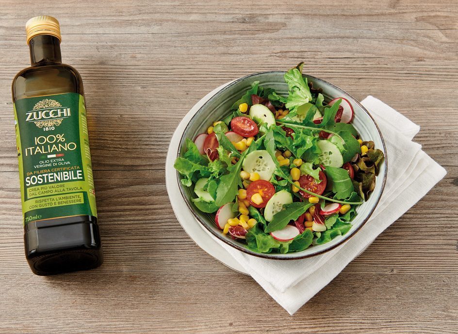 Mettere in un vasetto 3-4 cucchiai di olio extra vergine di oliva 100% Italiano da filiera certificata sostenibile Zucchi e il succo di limone o l’aceto, chiudere e agitare per circa 1 minuto ottenendo un emulsione da versare sull’insalata mista.
