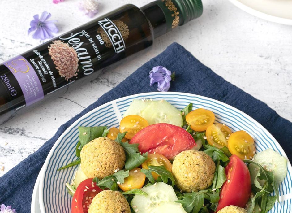 Componete l'insalata: tagliate il cetriolo a fettine molto sottili e i pomodori in 4 parti mettete nel piatto con la rucola, proseguite aggiungendo i falafel e i semi di sesamo; condite con l'olio di semi di sesamo Zucchi e accompagnate con l'hummus di ceci dove intingere i falafel.