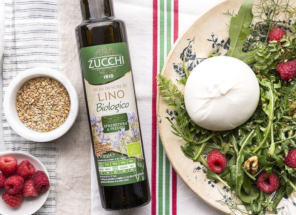 Misticanza con lamponi, mozzarella di bufala, noci e olio di semi di lino biologico Zucchi