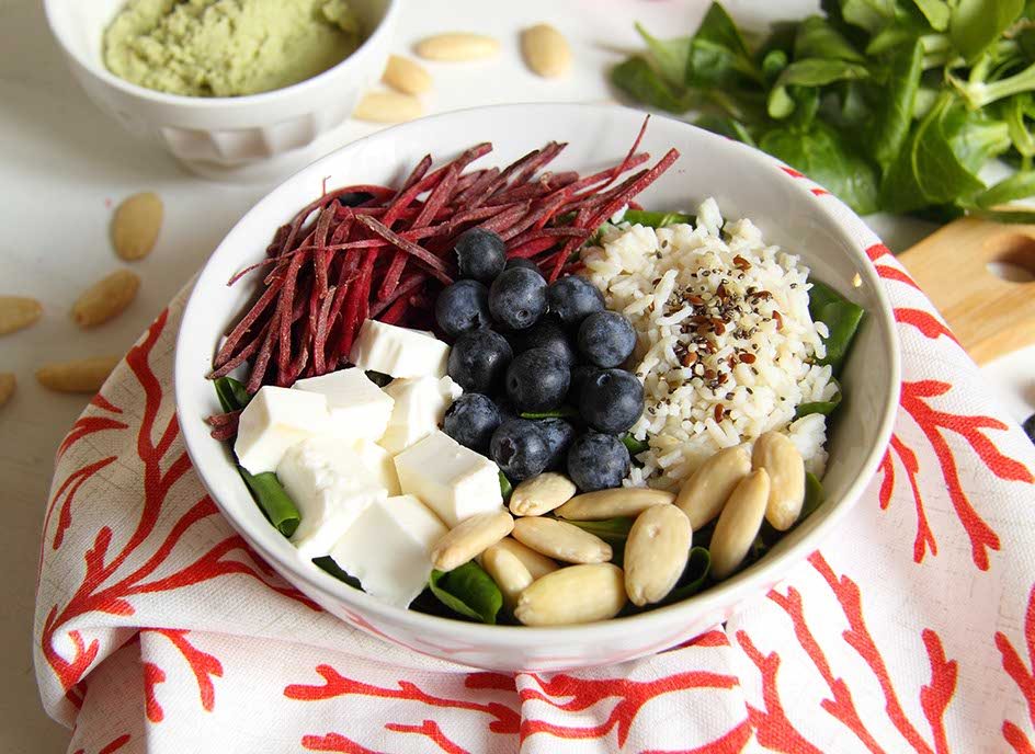 Lavate la valeriana e ponetela sul fondo della bowl, sopra adagiate la barbabietola a julienne, le mandorle, i mirtilli e il formaggio fresco a dadini.