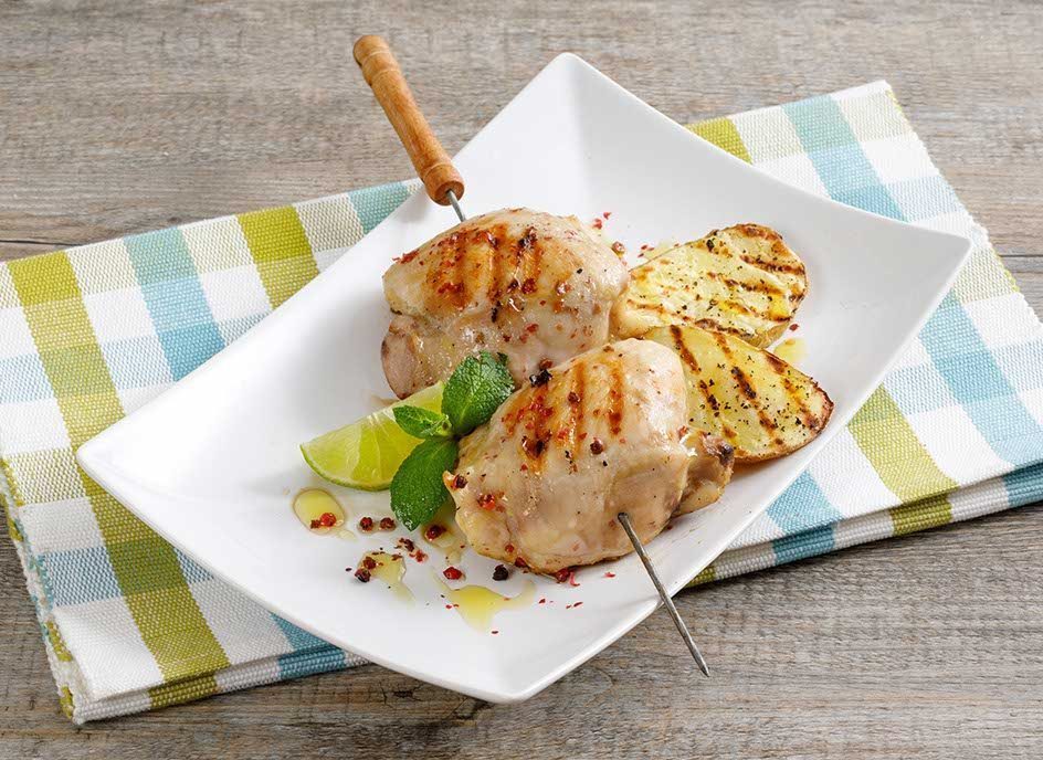 Spiedoni di pollo marinato con olio evo, lime, menta e pepe rosa