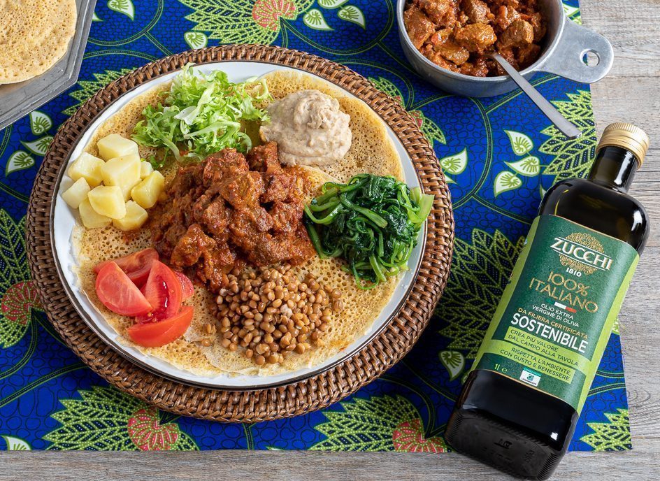 Mangiate con le mani staccando un pezzetto di injera e usandolo come cucchiaio per raccogliere carne, verdure e legumi e creare un boccone.