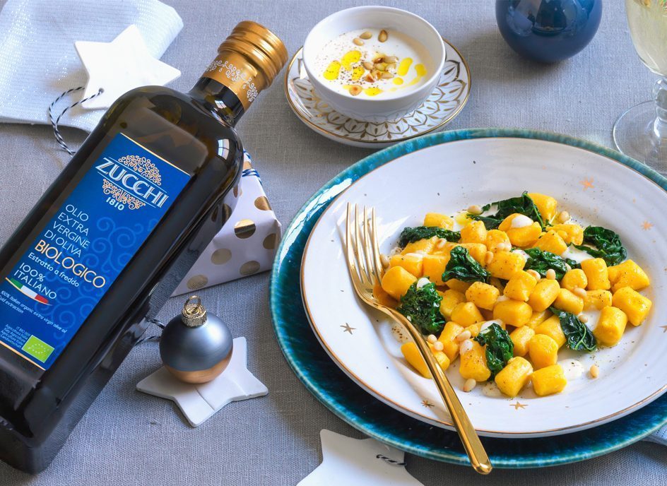 Gnocchi di zucca alla parigina, cavolo nero, pinoli in crema