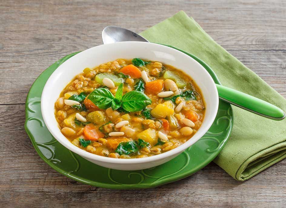 Minestra di verdure con condimento all’olio extravergine aromatizzato al pesto