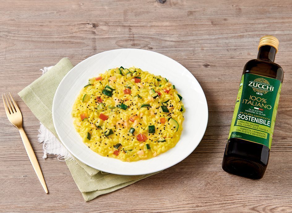 Risotto alle zucchine con mantecatura di salmone e olio evo 100% Italiano sostenibile Zucchi