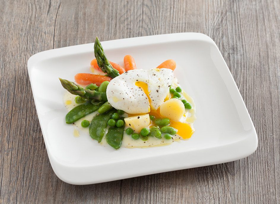 Bouquet di verdure primaverili con uovo in camicia e fonduta al parmigiano all’olio evo aromatizzato al tartufo