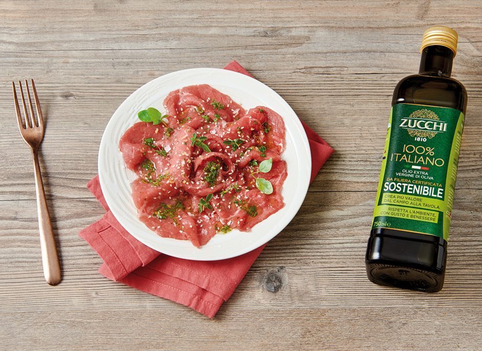 Carpaccio di carne con salsa da marinatura all’olio extra vergine di oliva sostenibile 100% Italiano Zucchi