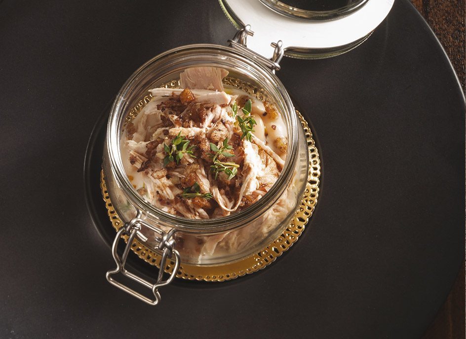 Finitura: Sgocciolate la carne dall’olio e sfilacciatela. Disponete sulla base dei vasetti da conserva un po’ di crema di fagioli al tartufo bianco, sovrapponetevi i fagioli cannellini e poi la carne sfilacciata, condite il tutto con olio evo e aceto balsamico e infine coprite con poco pane alle olive. Chiudete il vasetto e servite.